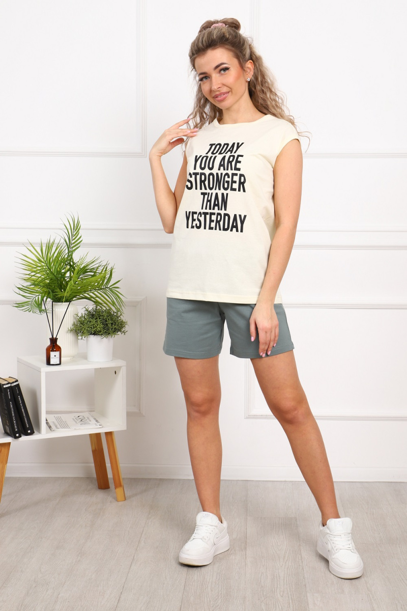 Костюм женский: футболка без рукавов, с принтом на полочке; шорты с боковыми карманами, на эластичном поясе. Комфорт 100% хлопка.