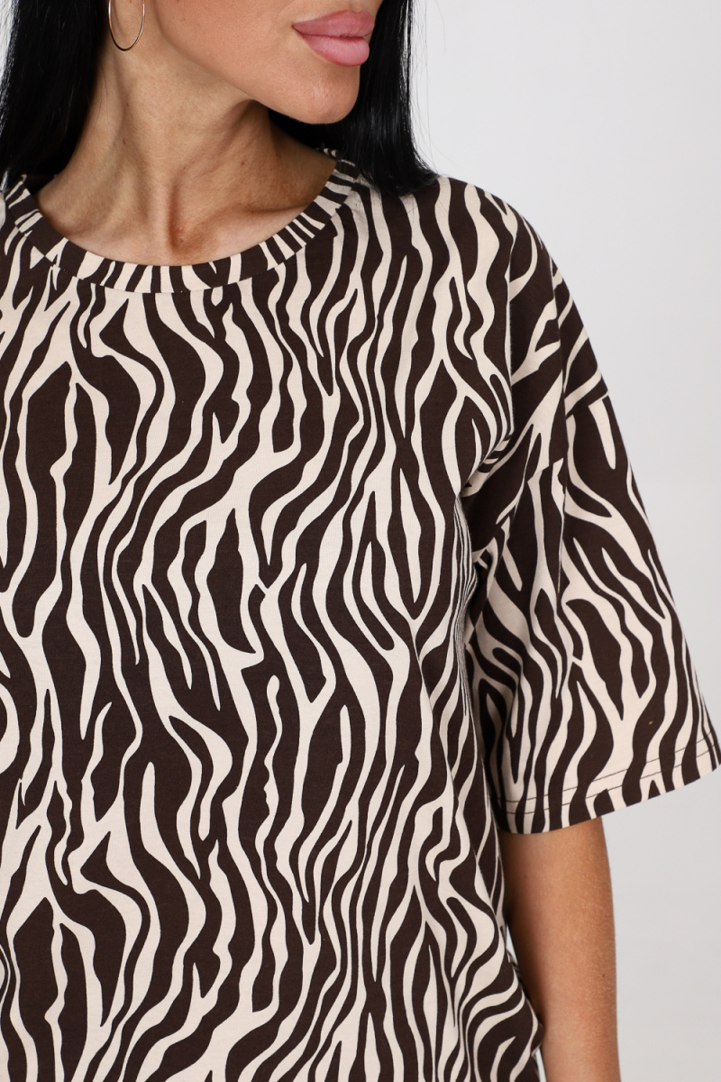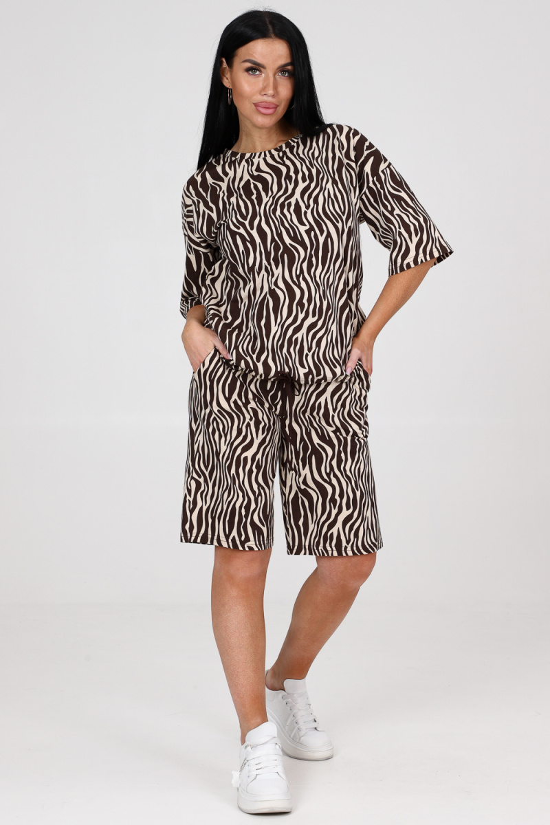 Костюм женский из кулирки. Костюм состоит из блузы и шорт. Блуза свободного покроя, рукав втачной, по низу изделия кулиса. Шорты на притачном поясе с карманами.
