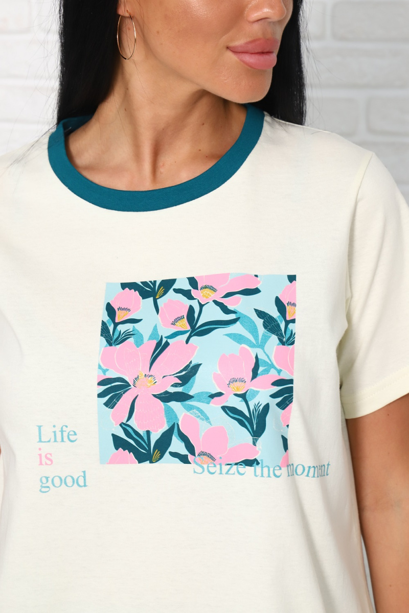 Костюм женский летней тематики: футболка с принтом, свободного кроя, шорты-бермуды оригинального кроя, с принтом а левой штанине, с боковыми удобными карманами и комфортным поясом.
