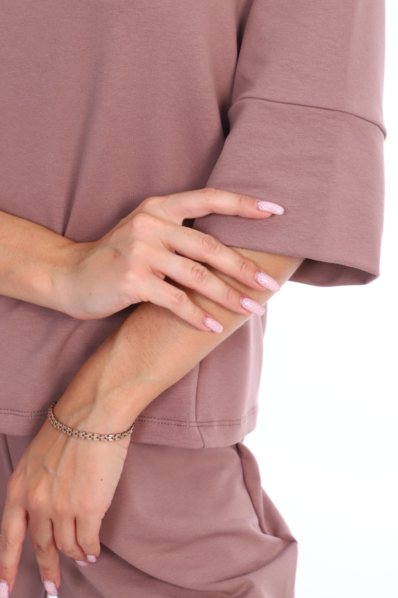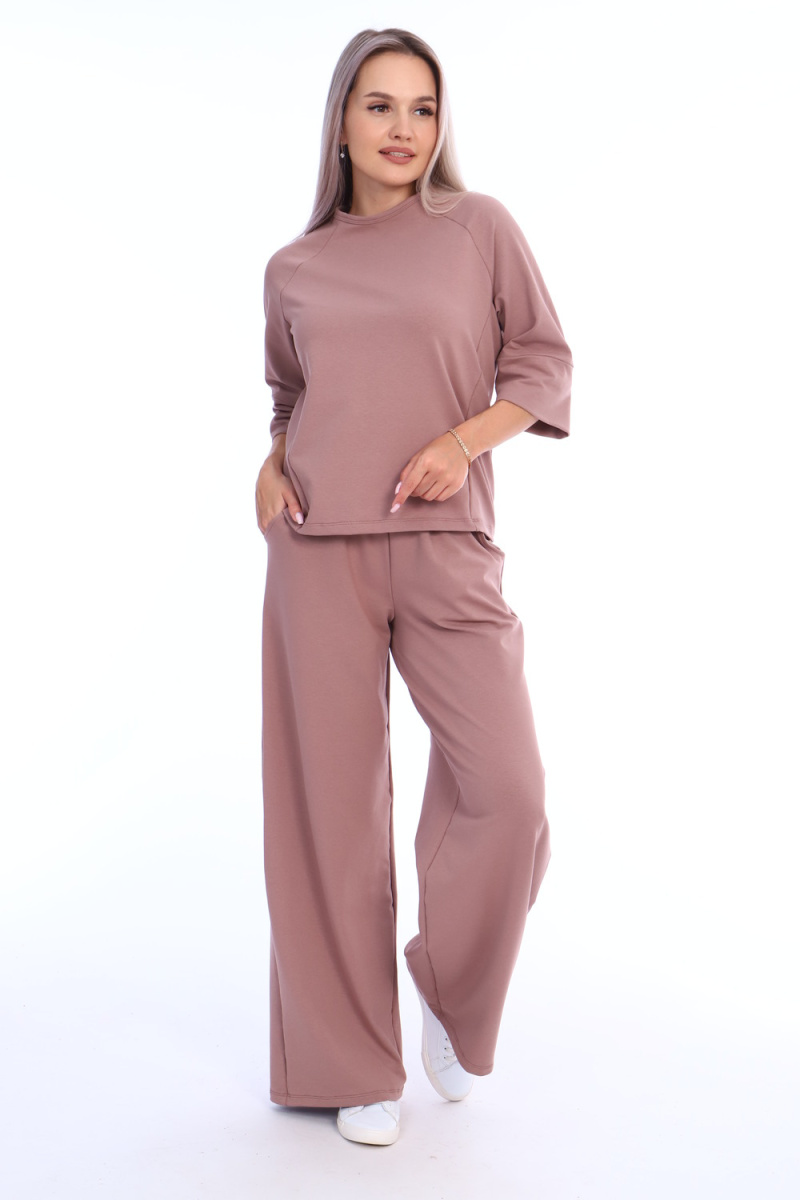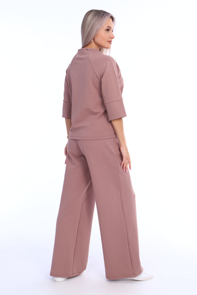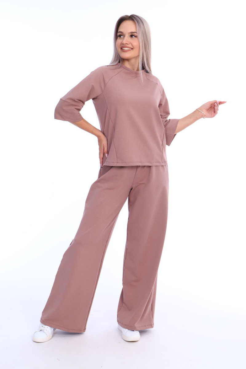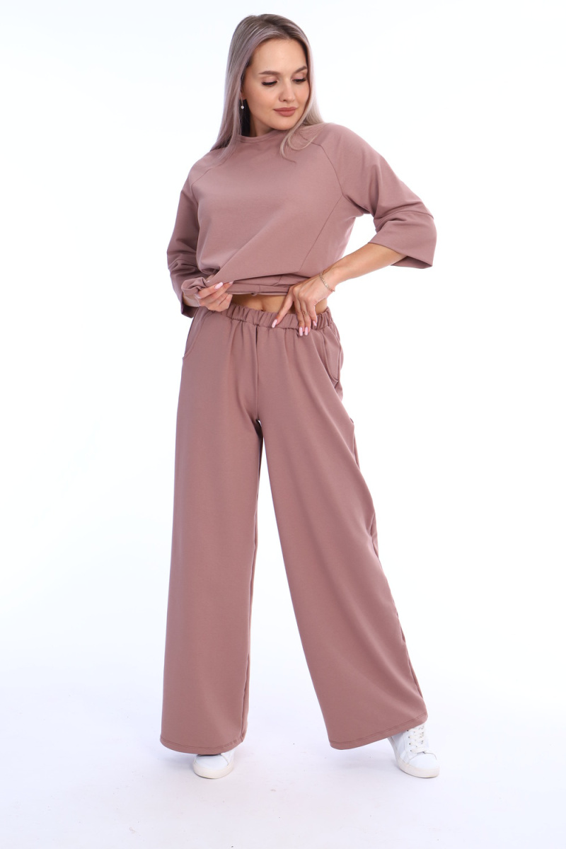Этот уютный женский комплект идеально подходит для домашнего отдыха и непринужденных выходов. Изготовленный из мягкого и комфортного футера, он обеспечивает непревзойденный комфорт и свободу движений. Брюки палаццо обладают широким покроем и эластичным поясом, который идеально облегает талию.Кофта с рукавом три четверти позволяет чувствовать себя комфортно в любой ситуации.
