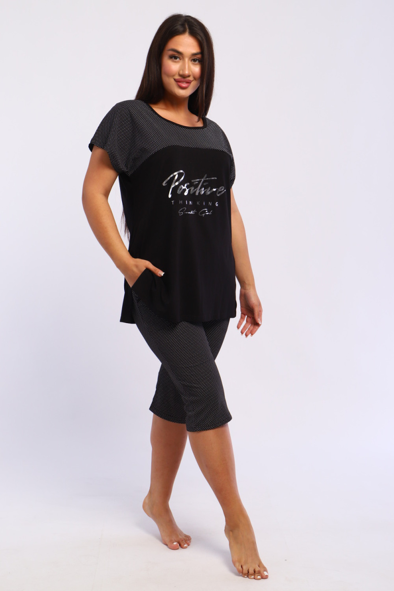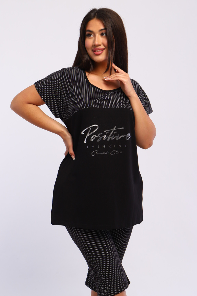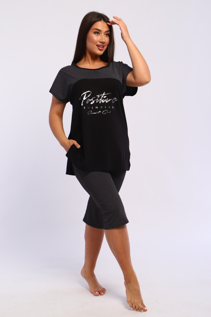 Костюм включает в себя стильную футболку и бриджи, выполненные из высококачественного материала, который гарантирует отличную воздухопроницаемость и приятные тактильные ощущения. Будьте уверены, что в этом комплекте вам будет удобно и тепло в любое время года. Он отлично сидит на фигуре и подчеркивает её достоинства, что особенно актуально для подходящей одежды больших размеров. Пижама с бриджами обеспечивает свободу движений, позволяя вам заниматься йогой, фитнесом или просто расслабляться на диване. Спортивный стиль костюма в сочетании с модными элементами поможет вам выглядеть стильно и современно даже в домашней обстановке. Футболка имеет удобный крой и не стесняет движений, что делает её отличным выбором для активного отдыха.
