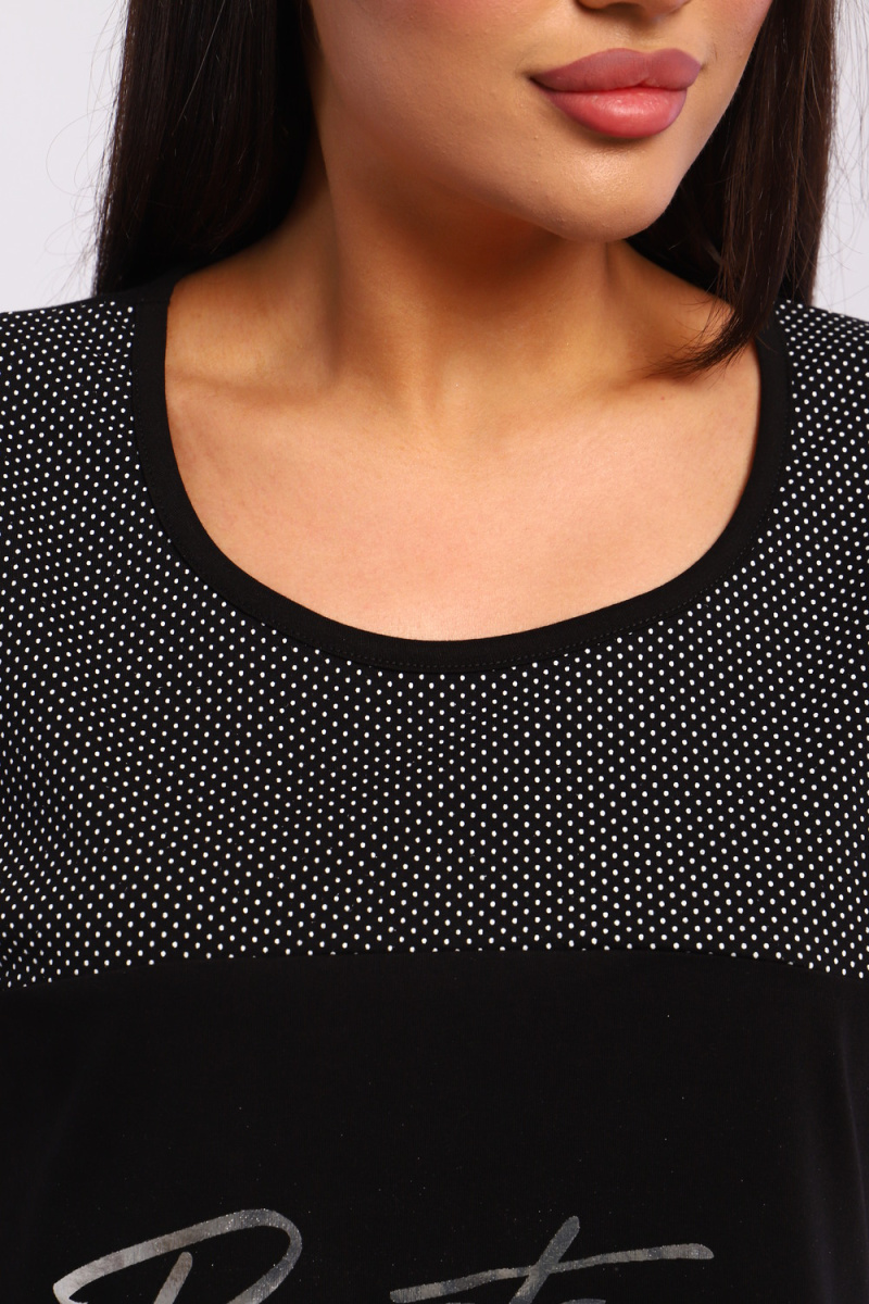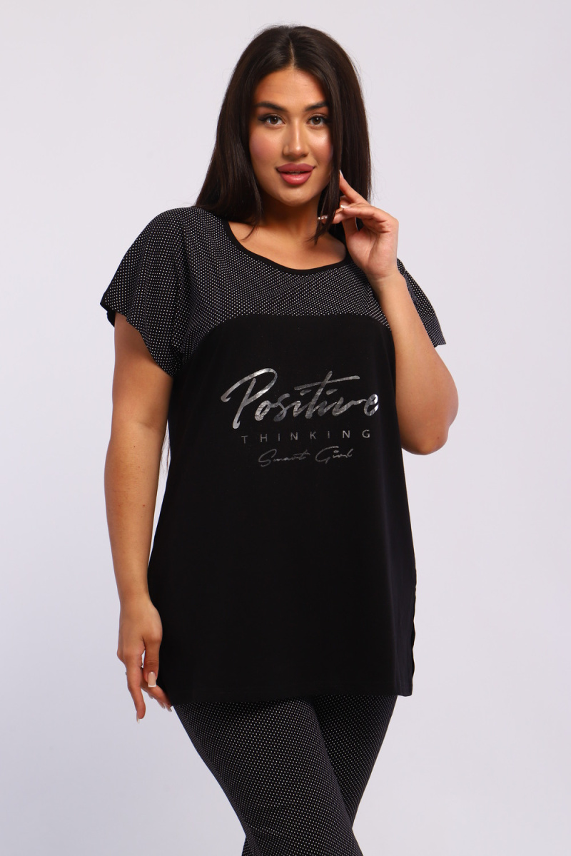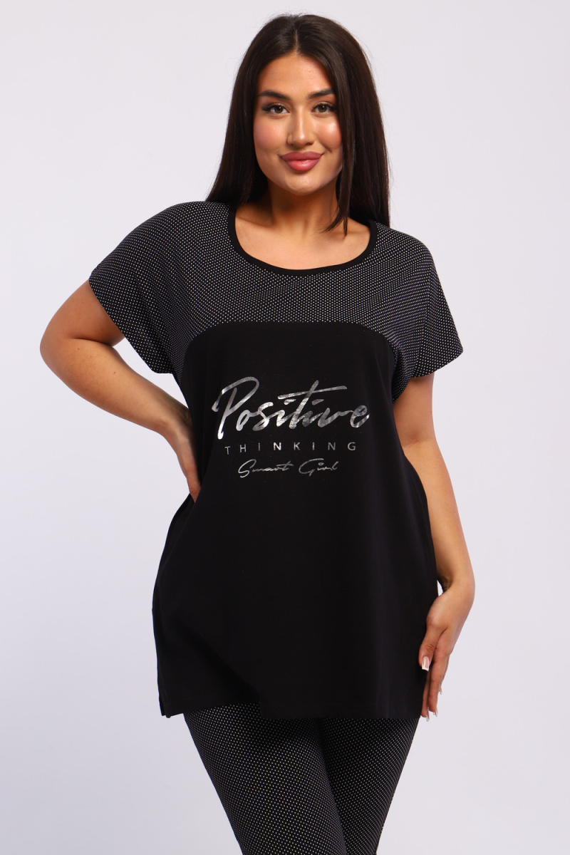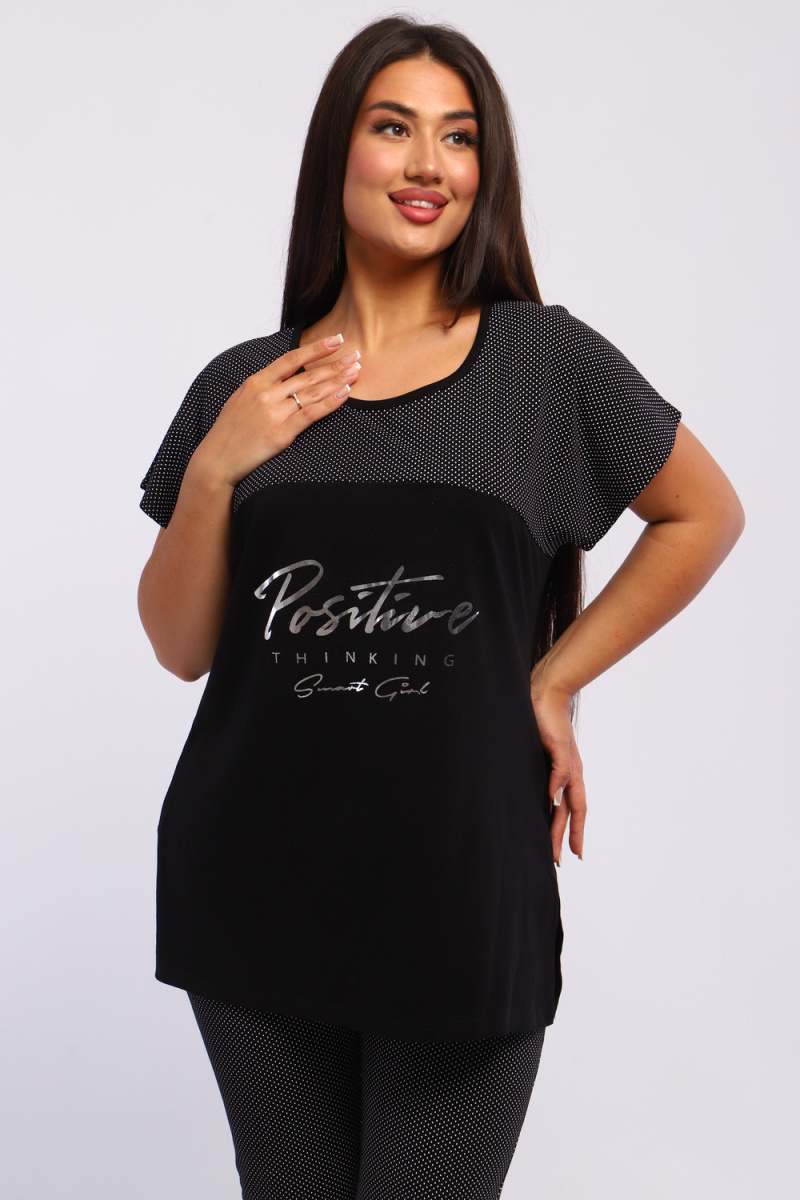 Костюм включает в себя стильную футболку и бриджи, выполненные из высококачественного материала, который гарантирует отличную воздухопроницаемость и приятные тактильные ощущения. Будьте уверены, что в этом комплекте вам будет удобно и тепло в любое время года. Он отлично сидит на фигуре и подчеркивает её достоинства, что особенно актуально для подходящей одежды больших размеров. Пижама с бриджами обеспечивает свободу движений, позволяя вам заниматься йогой, фитнесом или просто расслабляться на диване. Спортивный стиль костюма в сочетании с модными элементами поможет вам выглядеть стильно и современно даже в домашней обстановке. Футболка имеет удобный крой и не стесняет движений, что делает её отличным выбором для активного отдыха.